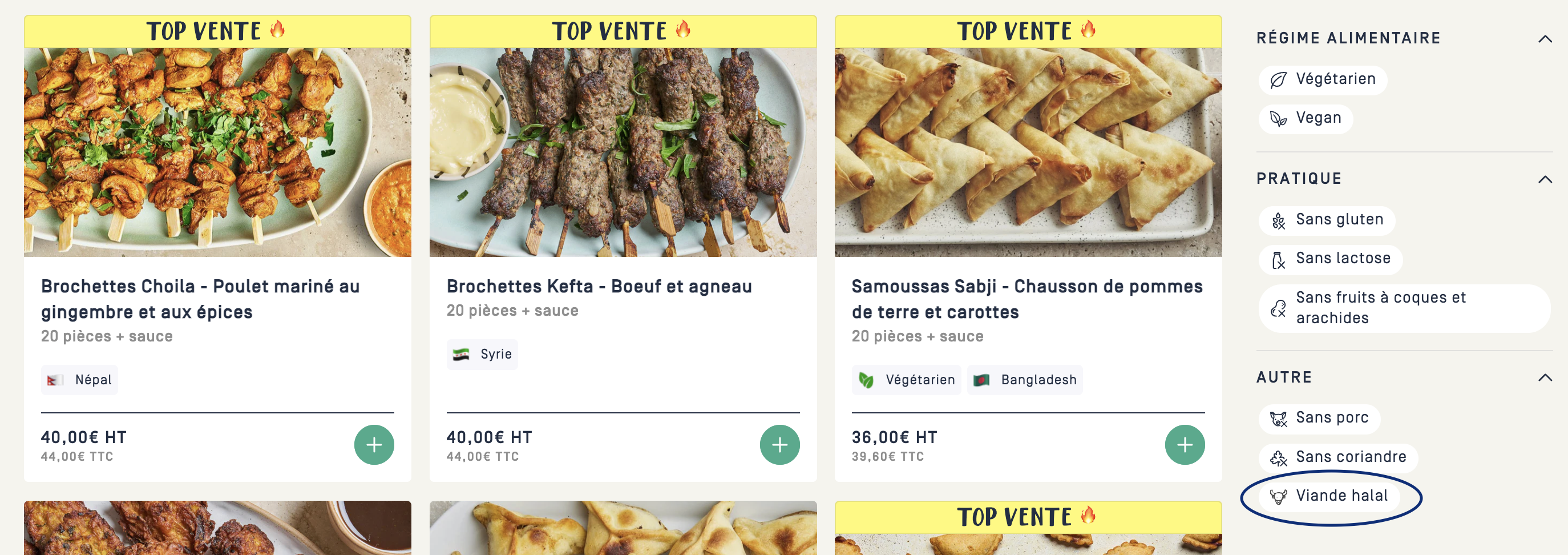 Nous proposons quelques produits à base de viande Halal. Pour voir les options disponibles, vous pouvez utiliser le filtre « Viande halal » sur le côté droit de notre site.