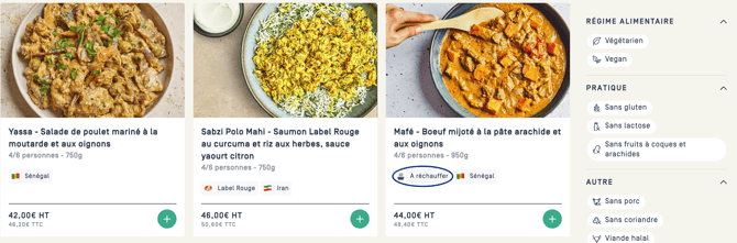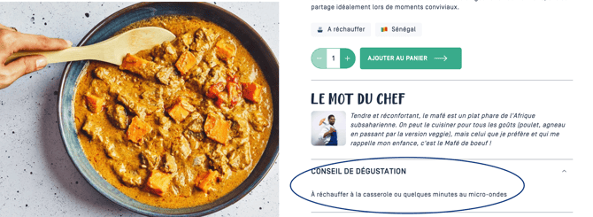 - Pour les plats à réchauffer (ceux avec un pictogramme), vous pouvez vous référer aux instructions "Conseil de dégustation" présentées sur chaque fiche produit.